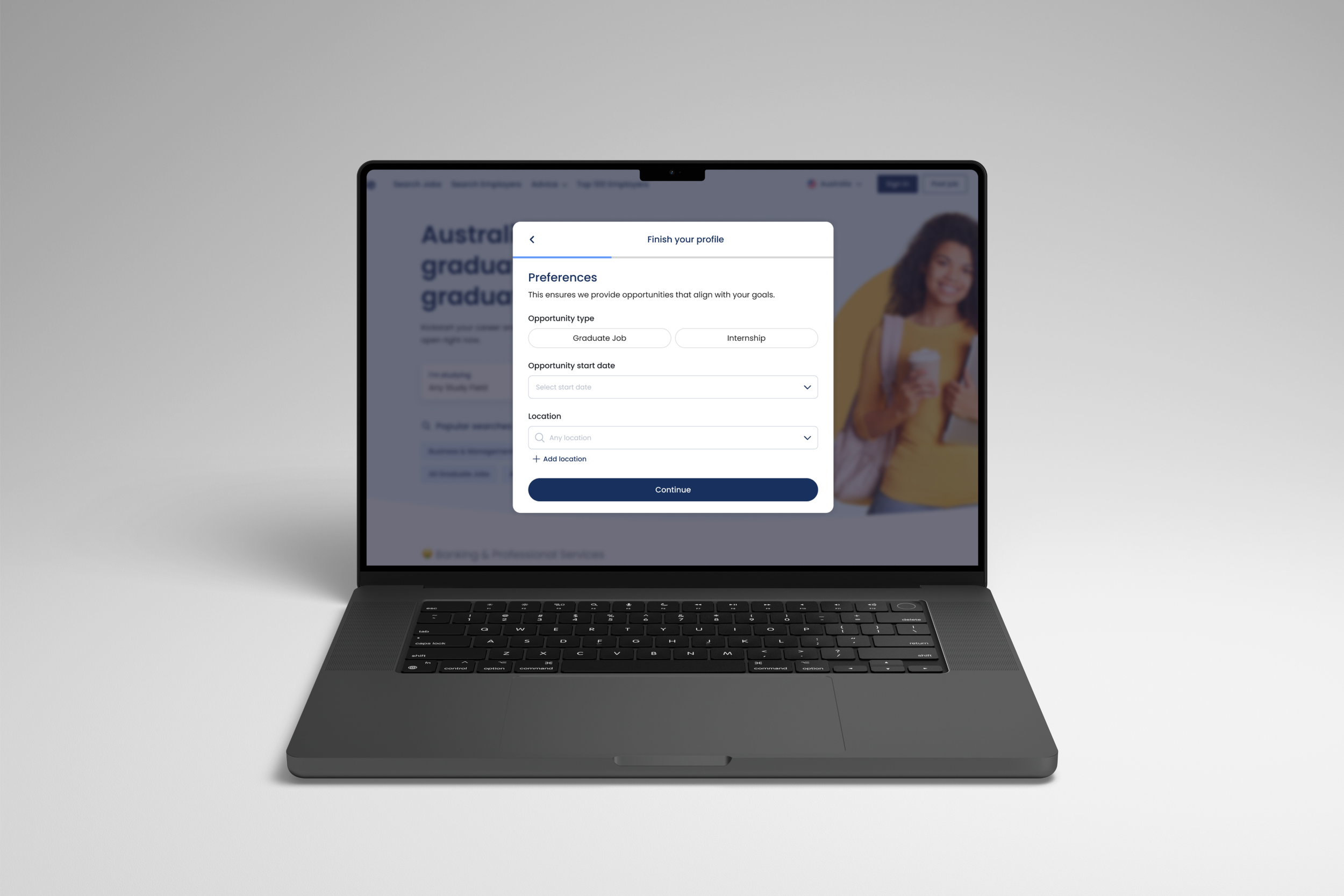 I led the end-to-end redesign of Prosple’s sign-up process to reduce user drop-off and better match students with relevant jobs. The goal was to increase reduce churn and increase profile capability to improve the product for students and employers through a seamless, low-friction experience that still adhered to user preferences.